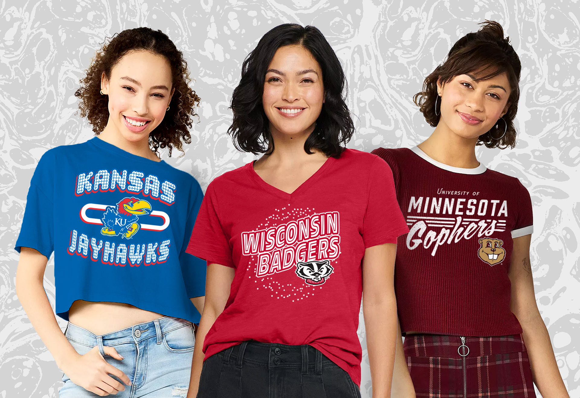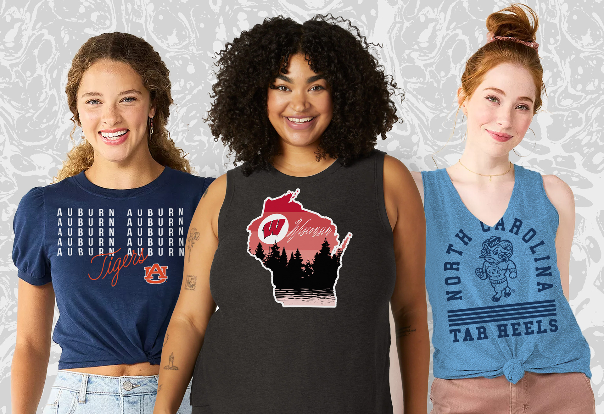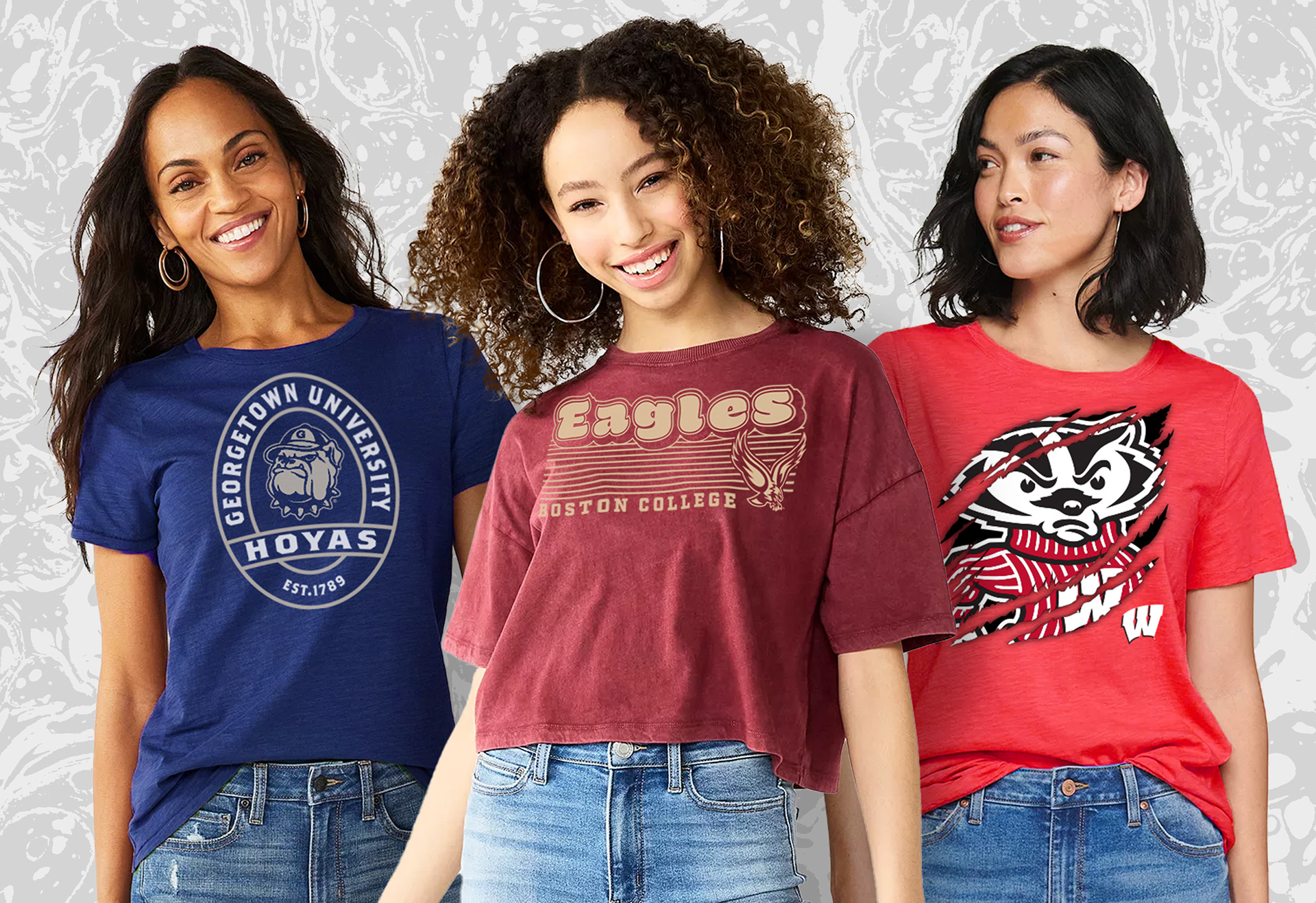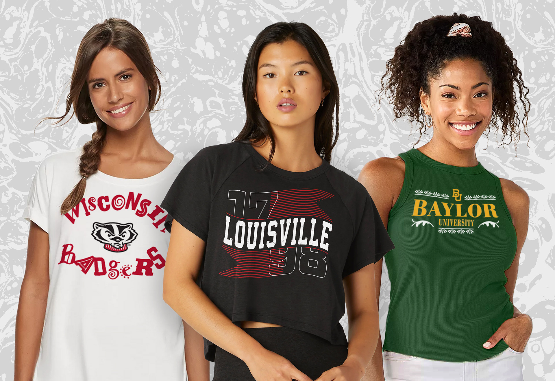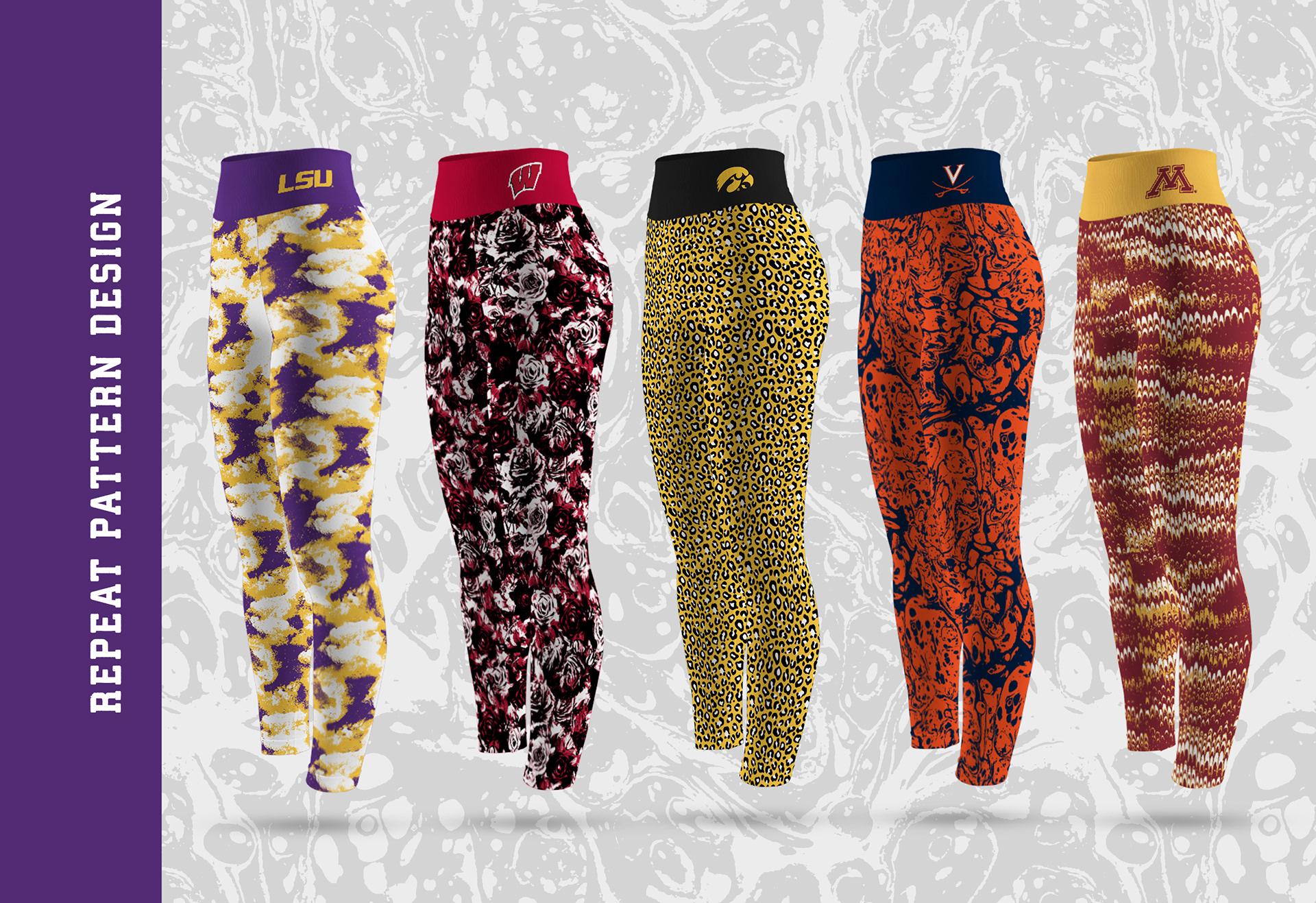 A collection of NCAA women's graphics and repeat patterns created for Zoozats Collegiate Apparel